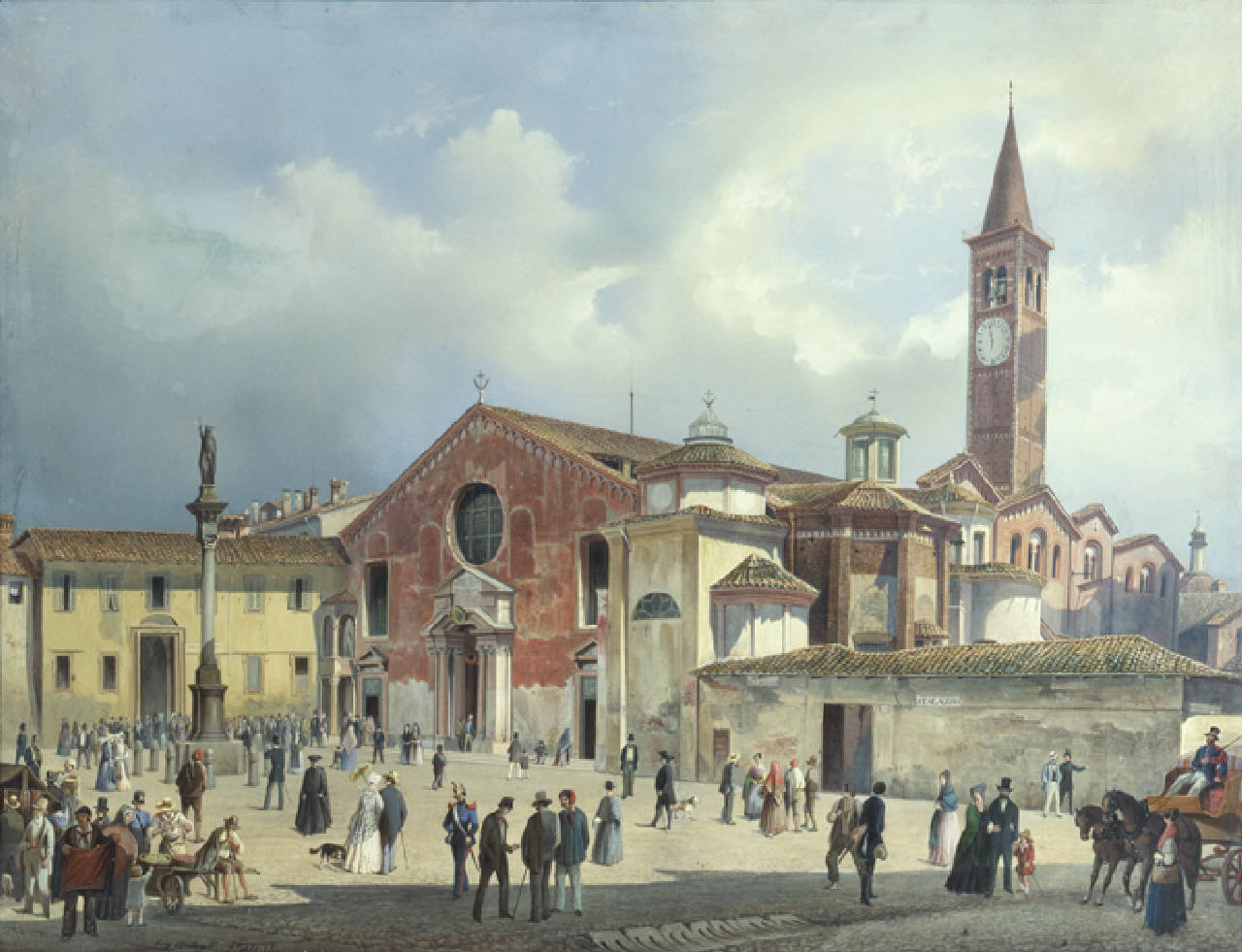 Piazza Sant'Eustorgio. La chiesa di Sant'Eustorgio a Milano con la piazza antistante gremita di personaggi