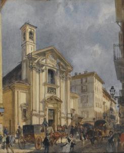San Giovanni Laterano già in via Tre Alberghi. La chiesa di San Giovanni Laterano che si trovava in via Tre Alberghi a Milano intorno al 1850, con passaggio di carrozze e pedoni