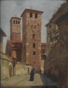 Torri e basilica di Sant'Ambrogio dal vicolo Sant'Agostino. Torri e fianco della basilica di Sant'Ambrogio a Milano visti dal vicolo Sant'Agostino