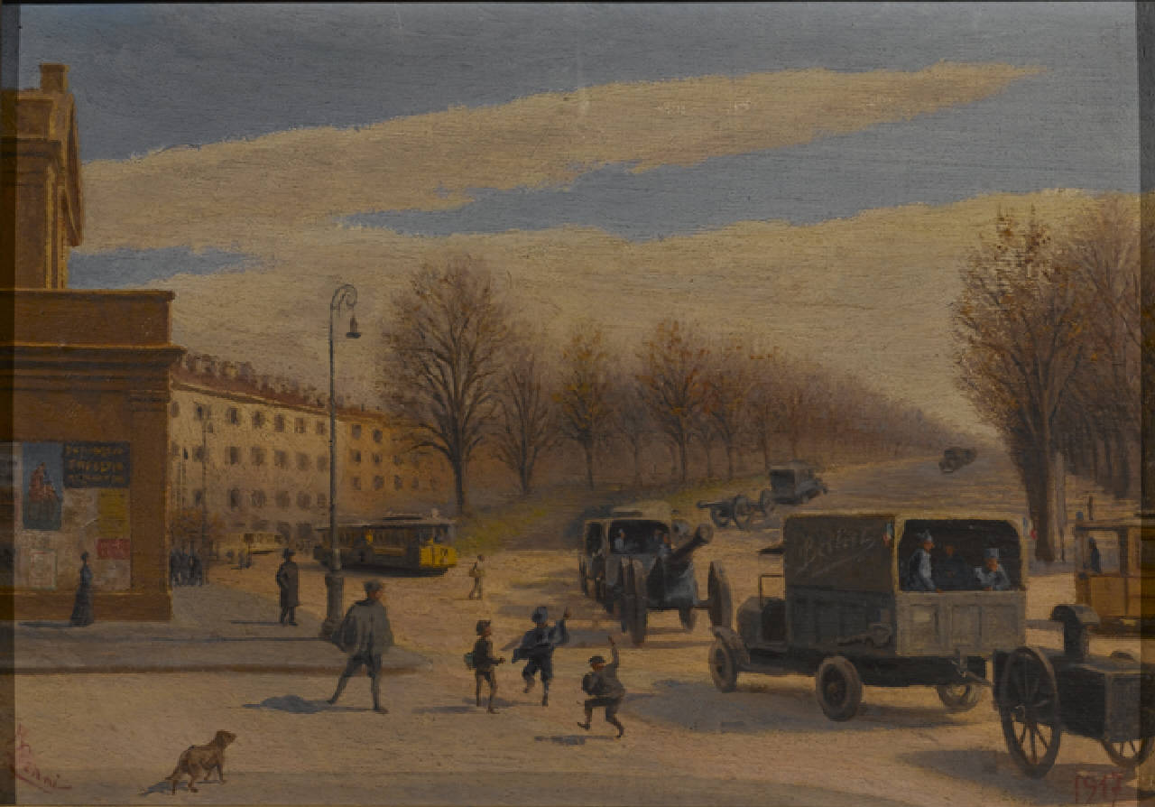 Bastioni di Porta Nuova e Venezia con passaggio di artiglieria francese. Le truppe dell'artiglieria francese sfilano negli autocarri diretti al fronte lungo i bastioni di Porta Nuova e Porta Venezia a Milano nel 1917
