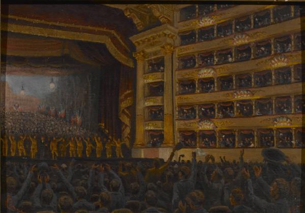 Teatro della Scala. Truppe alleate assistono a concerto patriottico. Soldati delle truppe alleate assistono a un concerto patriottico nel Teatro alla Scala di Milano, nel 1917