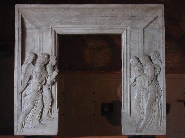 Raffigura due gruppi di angeli oranti entro una struttura architettonica coperta da un soffitto a cassettoni, aperta al centro, dove doveva trovarsi un'immagine sacra oggi perduta, inquadrata in una cornice modanata, forse un rilievo. Si tratta di quattro elementi assemblati e stuccati lungo le linee di congiunzione.