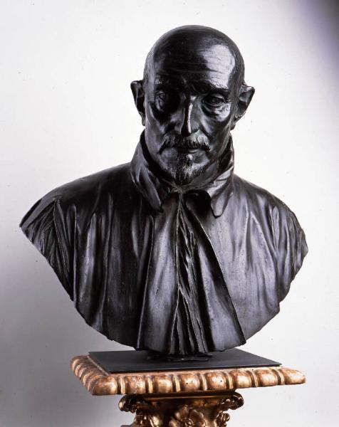 - NOTIZIE STORICO CRITICHE Il busto in bronzo, entrato nelle collezioni del Museo nel 1891, ritrae uno dei personaggi più in vista della vita religiosa del XVII secolo. Ulpiano Volpi (1559 - 1629), originario di una ricca famiglia di Como, fu arcivescovo di Chieti nel 1609 e vescovo di Novara nel 1619, ma visse in realtà prevalentemente in Vaticano, al servizio della Curia Romana, per la quale ricoprì importanti incarichi: nel luglio del 1621 fu nominato datario apostolico presso la Santa Sede e il pontefice Paolo V, suo grande estimatore, lo inviò come Nunzio Apostolico straordinario presso il re di Spagna, Filippo III.\nFacilitato dalle ricchezze familiari, Ulpiano fu anche un mecenate illuminato, come dimostrano alcune sue commissioni importanti, tra cui il palazzo di famiglia fatto erigere a Como, su progetto dell'architetto senese Sergio Venturi, che ne iniziò l'edificazione nel 1621. È in questa sede, in una nicchia della loggia al piano nobile, che il busto venne installato per volontà dell'erede Benedetto Volpi, il quale così facendo disattese però il progetto originario, che ne prevedeva la collocazione nella cappella di famiglia in San Donnino a Como, dove nel 1641 era stato deciso di inserire alcuni busti di membri illustri della famiglia.\nIl ritratto, commissionato dopo la morte del vescovo, è opera di Alessandro Algardi, uno dei protagonisti del Barocco romano. Antagonista di Gianlorenzo Bernini, lo scultore bolognese era tra i maggiori esponenti della corrente classicista del XVII secolo, rappresentata in particolare dalle opere di Nicolas Poussin, Andrea Sacchi, François Duquesnoy e Domenichino, che si contrapponeva a quella più genuinamente barocca, portata al massimo splendore invece dall'attività di Bernini. Formatosi presso l'Accademia di Ludovico Carracci a Bologna, Algardi fu inizialmente orafo a Mantova, chiamatovi dal duca Ferdinando Gonzaga, dove soggiornò e operò dal 1620 al 1624. Nel 1625 si trasferì a Roma, dove si occupò del restauro e della misurazione di statue antiche, su incarico del cardinale Ludovico Ludovisi, nipote di papa Gregorio XV. In questo modo poté approfondire la conoscenza del patrimonio classico, subendone gli influssi a livello figurativo, che univa abilmente nelle opere realizzate in questo periodo a forti ascendenze berniniane.\nIl busto di Ulpiano Volpi, databile all'inizio degli anni quaranta del Seicento, segna proprio questo momento di singolare avvicinamento di Algardi all'opera di Bernini, tanto che per un lungo periodo questo bronzo fu attribuito allo stesso Gianlorenzo. Lo stile di fusione, la struttura ossuta e sporgente della testa, la pelle tesa sugli zigomi e la lunga linea della bocca suggeriscono che il modello del busto non sia stato il vescovo stesso, ma piuttosto la sua maschera mortuaria - cioè un calco in gesso preso direttamente dal volto del defunto -, rielaborata successivamente nei baffi e nella barba, nel trattamento degli occhi e del loro contorno. Inoltre nella definizione dei capelli e della mascella emerge in maniera evidente l'aspetto del modello in terracotta, dove la superficie poco levigata, se da un lato contribuisce a dare un aspetto piuttosto grezzo al ritratto, dall'altro restituisce dei lineamenti del volto molto marcati, che traducono un'immagine di grande forza e vigore. La solidità del modellato e la qualità della fattura permettono di ricondurre con sicurezza l'opera alla piena maturità dell'Algardi. (Colle, 1996)