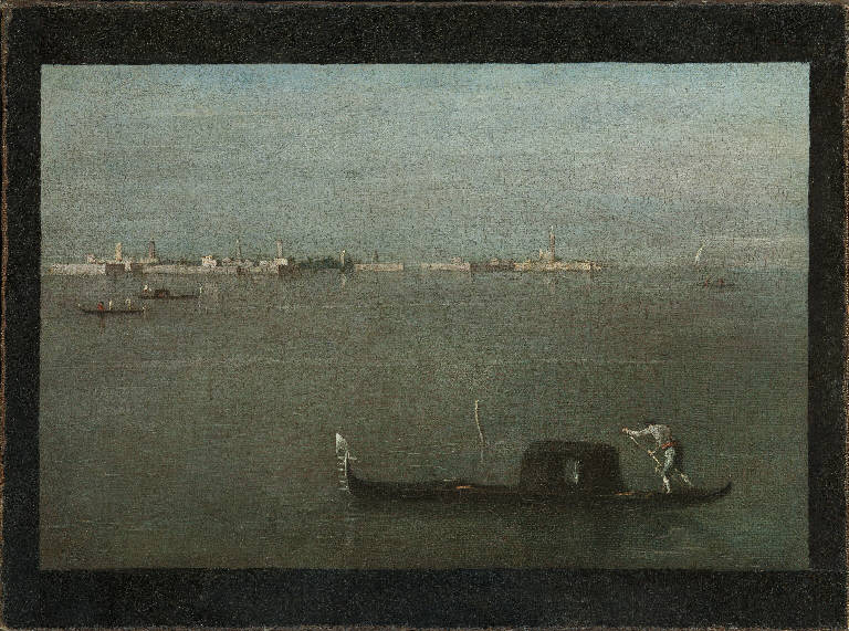 - NOTIZIE STORICO CRITICHE Acquistata nel 1898 da G. Bertini per 2500 lire (Archivio del Museo Poldi Pezzoli, faldone 14/a), questa celebre veduta lagunare ha subito in passato varie manipolazioni di cui non è agevole riconoscere, allo stato attuale delle indagini tecniche sul dipinto, la reale estensione. Essa appare oggi delimitata da quattro ampi margini copiosamente ridipinti, di cui almeno quello che affianca a destra la superficie pittorica sembra spettare al supporto originario. Alcuni studiosi hanno supposto che l'opera, retta da un singolare equilibrio compositivo, sia un "frammento tagliato con stupefacente intelligenza di misure spaziali" (Russoli, 1972, pp. 262-263; ma prima ancora Zampetti, 1965, p. 183). L'andamento curvilineo della trama della tela lungo il bordo inferiore e lungo quello di sinistra esclude tuttavia che essa abbia subito decurtazioni su questi lati; non è invece improbabile che il dipinto sia stato ridotto di dimensioni lungo gli altri due margini. Contraddistinta da una sottilissima pellicola cromatica, l'opera appare inoltre offuscata da una densa vernice ossidata che maschera abrasioni (estese soprattutto a destra) e ritocchi, avvertibili particolarmente lungo il margine superiore e nell'angolo inferiore di sinistra. Unanimemente considerato come uno dei capolavori del vedutismo poetico di Francesco Guardi che qui trascrive "in termini pittorici l'emozione di un istante di luce colto nella pace della laguna" (Pallucchini, 1960, p. 251), il dipinto è condotto con una ristretta gamma di colori in cui predominano i grigi e gli azzurri, e, appena con qualche lontana luce rosata" (Moschini, 1956, p. 26) che delinea i muraglioni e i campanili della\ncittà che appare sullo sfondo. Incerta è d'altronde l'identificazione del sito rappresentato (forse una delle estreme propaggini di Murano), qui composto secondo un taglio del tutto inedito nel repertorio del pittore veneziano. Gli storici concordano nell'attribuire a questa tela un valore premonitore per lo sviluppo ottocentesco della pittura di paesaggio; contrastanti sono invece i giudizi che concernono la sua datazione. Rilevando la nettezza del profilo della veduta e l'omogeneità cromatica con cui sono eseguite le superfici, C.L. Ragghianti (1953, p. 105), V. Moschini (1956, p. 26) e A. Morassi (1973, p. 432) hanno proposto di collocare il dipinto negli anni tra il 1750 e il 1760. Un'opinione diversa è stata invece sostenuta da R. Pallucchini (1960, p. 251), che interpreta l'inusitata sobrietà compositiva come un segno dell'esaurimento della fantasia capricciosa del pittore e che stima quindi di dovere riferire il dipinto agli anni estremi della sua attività, intorno al 1790. Tale collocazione cronologica ha trovato altri sostenitori in E. Arslan (1935-1936, pp. 443-444), in L. Rossi Bortolatto (1974, pp. 126-127) e in M. Levey (1971, p. 121) che vi ha riscontrato alcune affinità di composizione con la Gondola sulla laguna della National Gallery a Londra (n. 1454; tela, 29,5x44,5 cm). Tuttavia i forti residui della vedutistica canalettiana e innegabili analogie di gamma cromatica e d'esecuzione pittorica con L'isola di San Cristoforo presso Murano di collezione privata a Milano (Morassi, 1973, p. 430, n. 645) e con la Veduta di Prà della Valle a Padova del Musée des Beaux Arts a Digione (inv. n. J. 171: Morassi, 1973, pp. 437-438, n. 684; Guillaume, 1980, p. 36, n. 56) consigliano di suggerire anche per questo dipinto una datazione prossima al 1765, come già era stato proposto da F. Russoli (1955, p. 167).\nNon si conoscono disegni di Francesco Guardi in diretto rapporto compositivo con questa tela. (Natale, 1982)