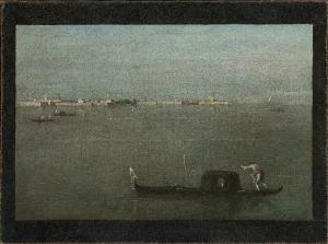 Dipinto ad olio su tela con la veduta della laguna. La città, forse Murano, è sullo sfondo e mentre una gondola con gondoliere sono in primo piano.