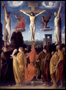 - NOTIZIE STORICO CRITICHE Sconosciuta è l'ubicazione originaria. Nel 1806 risulta già a Brera. Secondo il Mongeri (1872) la presenza dell'opera nel nucleo più antico di pitture della Pinacoteca di Brera, dimostrerebbe la sua originaria collocazione nella chiesa di Santa Maria di Brera, già degli Umiliati, dove avrebbe costituito un'anta d'organo. Il Mulazzani (1974) ipotizza invece una stretta connessione del dipinto con le sedute preparatorie del Conciliabolo di Pisa, svoltesi nel Duomo di Milano: il dipinto proverrebbe perciò proprio dal Duomo di Milano. Anche questa ipotesi deve essere però valutata con cautela. Il Longhi (1916) per primo ha rivalutato la poetica bramantiniana, soprattutto quella collegata ai suoi 'sogni di architettura nei fondi dei quadri'. L'edificio a destra, sotto la figura del demonio, è stata identificata come la cappella Trivulzio (edificio progettato dal Bramantino, ma giunto a noi in forma imperfetta) da numerosi studiosi, trasmette la concezione più completa degli ideali architettonici dell'artista, all'interno di una visione urbanistica di pura poesia. Secondo Mulazzani (1974) il dipinto rappresenterebbe le origini della Chiesa e della Cristianità, secondo un sermone di Aelredo di Rielvaulx in commento ad alcuni passi di Isaia, intese come 'Plenitudo Temporis' e 'Plenitudo Gentis'. Il cubo lontano a destra rappresenterebbe la roccia del deserto sulla quale si fermò Loth, e perciò simbolicamente il luogo dove nacque Cristo; la piramide simboleggerebbe l'esilio in Egitto, e l'edificio più in alto, a destra della Croce, la Sinagoga, sede di profeti e filosofi. La parte destra rappresenterebbe perciò tutto ciò che precede la religione cristiana e cioè la cultura ebraica che a sua volta affonda le sue radici nella cultura egiziana e pagana, viste tuttavia come imperfette (poste sotto il simbolo della luna e del diavolo); la parte sinistra rappresenterebbe l'avvento di Cristo con il suo sacrificio (la crocifissione), che ha vinto il demonio e liberato dalla terra, rendendola libera di fruttificare (gli alberi cresciuti a sinistra), il tutto illuminato dalla luce della Verità (il sole). Tale simbologia sarebbe stata adattata, sempre secondo il Mulazzani, dai circoli milanesi che invocavano una riforma della chiesa, ed in particolare dai prelati che organizzarono il Conciliabolo di Pisa le cui sedute preliminari avvennero nel Duomo di Milano (1510). La Navarro (1982) ha proposto invece di mettere in relazione la crocifissione con il circolo di Santa Marta, visto anche i legami degli intellettuali che vi facevano parte con con le figure coinvolte nei preparativi del Conciliabolo di Pisa. Stretti restano comunque i legami con la figura del Maresciallo Trivulzio, dal momento che evidenti sono le affinità fra quest'opera e la serie dei Mesi, per lui eseguiti dal Bramantino fra il 1504 ed il 1509. Il silenzio delle fonti su quest'opera del Bramantino potrebbe del resto essere spiegata anche con una committenza strettamente privata dell'opera che, come la serie degli arazzi raffiguranti i Mesi, potrebbe essere stata eseguita dal Bramantino per il trivulzio e perciò destinata al suo palazzo (già in via Rugabella).