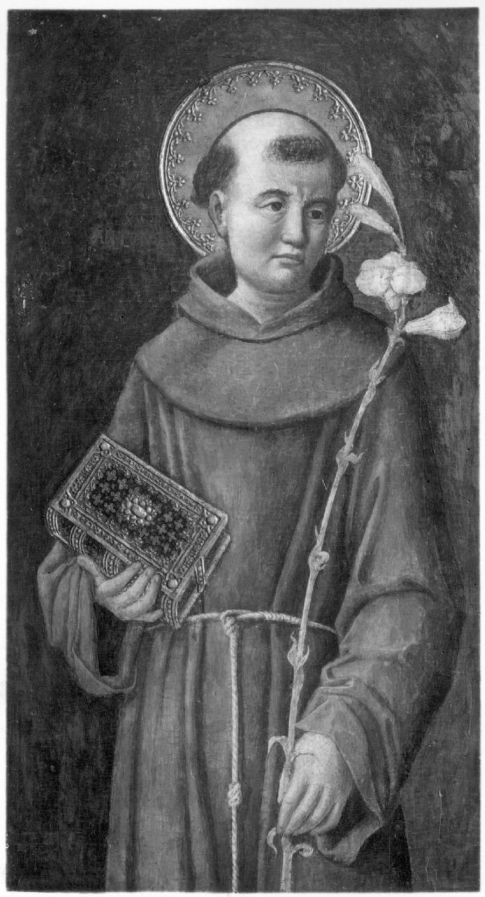- NOTIZIE STORICO CRITICHE Acquisto del conte Luigi Tadini come opera di Giovanni Vivarini. L'attribuzione a Francesco dai Libri fu avanzata dal Berenson (1925, com. or.), mentre quella ad Antonio Vivarini, nella sua tarda attività, dal Pallucchini (1960, com. scritta). \nUna corretta lettura dell'opera si deve a G. Valagussa, 2000. \nRecentemente Andrea De Marchi (comunicazione orale), riprendendo un contributo di R. Longhi , ha proposto di riconoscere la tavola come opera di collaborazione tra Antonio e Bartolomeo Vivarini, cui si dovrebbero rispettivamente l'espressione del santo e il panneggio, di grande modernità.\nM. Albertario\n\nNel 1960 Roberto Longhi pubblicò le foto di una Sant'Apollonia e di una Santa Lucia (1960), molto vicine al Sant'Antonio nel disegno dell'arco trilobo e nella fattura delle aureole, senza però far menzione della tavola della Tadini. Il possibile legame tra i tre dipinti era stato invece rilevato da Federico Zeri, ipotizzando anche una vicinanzanza con il San Bernardino di Capodistria (nota manoscritta sul verso della foto di Sant'Antonio conservata presso la Fototeca Zeri, Foto INVN 61312). \nAndrea Luigi Casero
