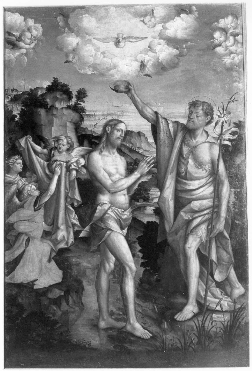 - NOTIZIE STORICO CRITICHE Le fisionomie dei corpi nervosi e segnati del Cristo e del Battista ricordano quelle dei santi della tavola posta sull'altare di San Sebastiano nel Duomo di Crema, datata al 1518. Il manierismo turbina per tutta la tela e avvolge i due angeli sulla sinistra e il manto del Battista, denotando una ricerca verso tale direzione che il pittore opera costantemente a partire dagli anni venti del Cinquecento. Assieme alle altre opere lasciate o inviate nella cittadina lombarda da pittori veneti come Vincenzo Catena e Giovanni Cariani, il dipinto di Paris Bordon presente in Pinacoteca sembra fornire diversi elementi al maestro cremasco: le pose artefatte degli angeli, la postura studiata di Giovanni Battista e la torsione del Cristo, qui interpretata in modo imperfetto. Tipicamente veneti sono anche le tonalità dei manti e il cielo acceso di rosa e arancione, che sovrasta un paesaggio per la verità ancora legato a modelli quattrocenteschi e più lombardo.\nProprio questa natura a metà fra due mondi ha fatto ritenere la pala opera più di bottega che di mano di Vincenzo Civerchio, all'epoca della realizzazione sicuramente già anziano e prossimo alla morte (avvenuta nel 1544). Ma il marchio civerchiano va riconosciuto specialmente nei particolari di qualità più elevata della pala, come il paesaggio così pieno di particolari o il bel volto del Cristo, dominato dagli occhi blu e da fluenti capelli.\nG. Cavallini