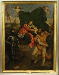 - NOTIZIE STORICO CRITICHE La pala viene descritta già nei primi anni trenta del Cinquecento dal Michiel su un altare di destra della chiesa di Sant'Agostino. Si tratta di un dipinto realizzato in memoria di Giulio Manfron, condottiero di origine vicentina, ritratto nel san Giorgio. La sua morte il 15 agosto 1526 e le motivazioni stilistiche fanno ritenere plausibile una datazione fra il 1526 e il 1527. Bordon aveva realizzato sempre per Crema la pala con la Pentecoste, proveniente dalla chiesa di Santa Maria Maddalena e Santo Spirito e ora a Brera. Del dipinto esistono due copie, una - modesta - conservata presso l'Accademia Tadini e una presso la parrocchiale di Castelleone, vicino a Crema.\nG. Cavallini\n\nIl dipinto risulta acquistato dal conte Luigi Tadini il 26 marzo 1805 per 364 lire e sedici soldi. Per i dati circa il passaggio dell'opera nella collezione (già in parte segnalati da Frizzoni 1903) si vedano Albertario 2015 e Albertario 2021. \nNella sua monografia, A. Donati (2014) suggerisce di anticipare la datazione al 1523-1527, sulla base di due elementi: la somiglianza del personaggio ritratto nelle vesti di San Giorgio (identificato con Giulio Manfron) con l'uomo che compare nel ritratto della Alte Pinakotek di Monaco di Baviera, datato 1523, che propone di identificare con il Manfron appunto, e la stretta reazione all'affresco con San Cristoforo realizzato da Tiziano in Palazzo Ducale, che propone di anticipare al 1523. \nIl recente intervento di Savy (2021) suggerisce invece di orientare la cronologia verso il 1526-1527.\nM. Albertario