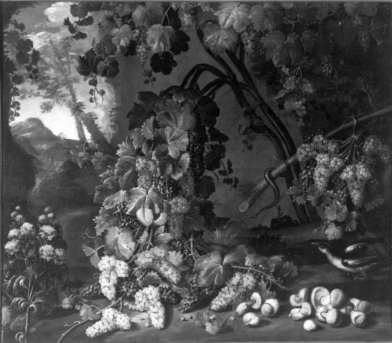 Natura morta con fiori, frutta e funghi