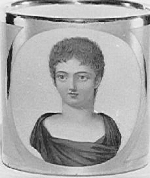 Tazzina di forma cilindrica, dipinta in rosa salmone e bordi oro, entro ovale figura maschile a mezzo busto.