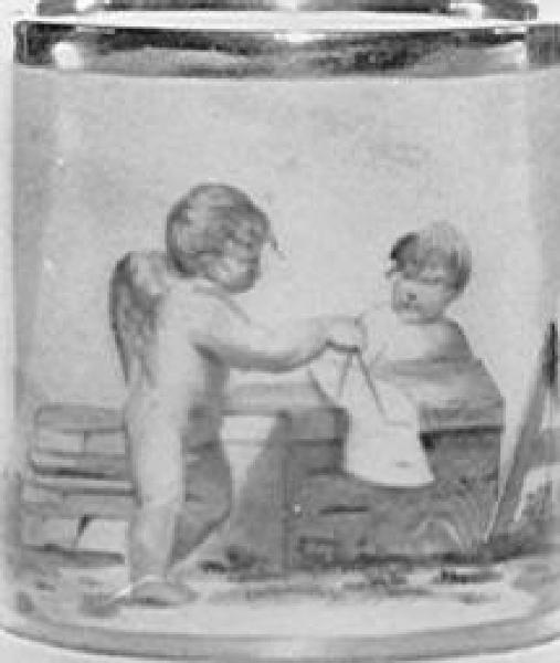 Tazzina cilindrica con ansa, dipinta a monocromo con puttini ed emblemi dell'architettura su un fondo giallo; bordo dorato