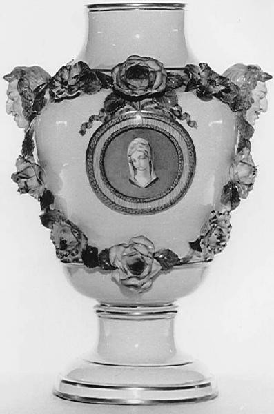 Vaso in porcellana bianca a forma di anforetta con festoni di roselline in tutto rilievo e due mascheroni che fungono da ansa. Sul corpo del vaso, entro medaglioni, busti di figure femminili su sfondo rosa opaco.