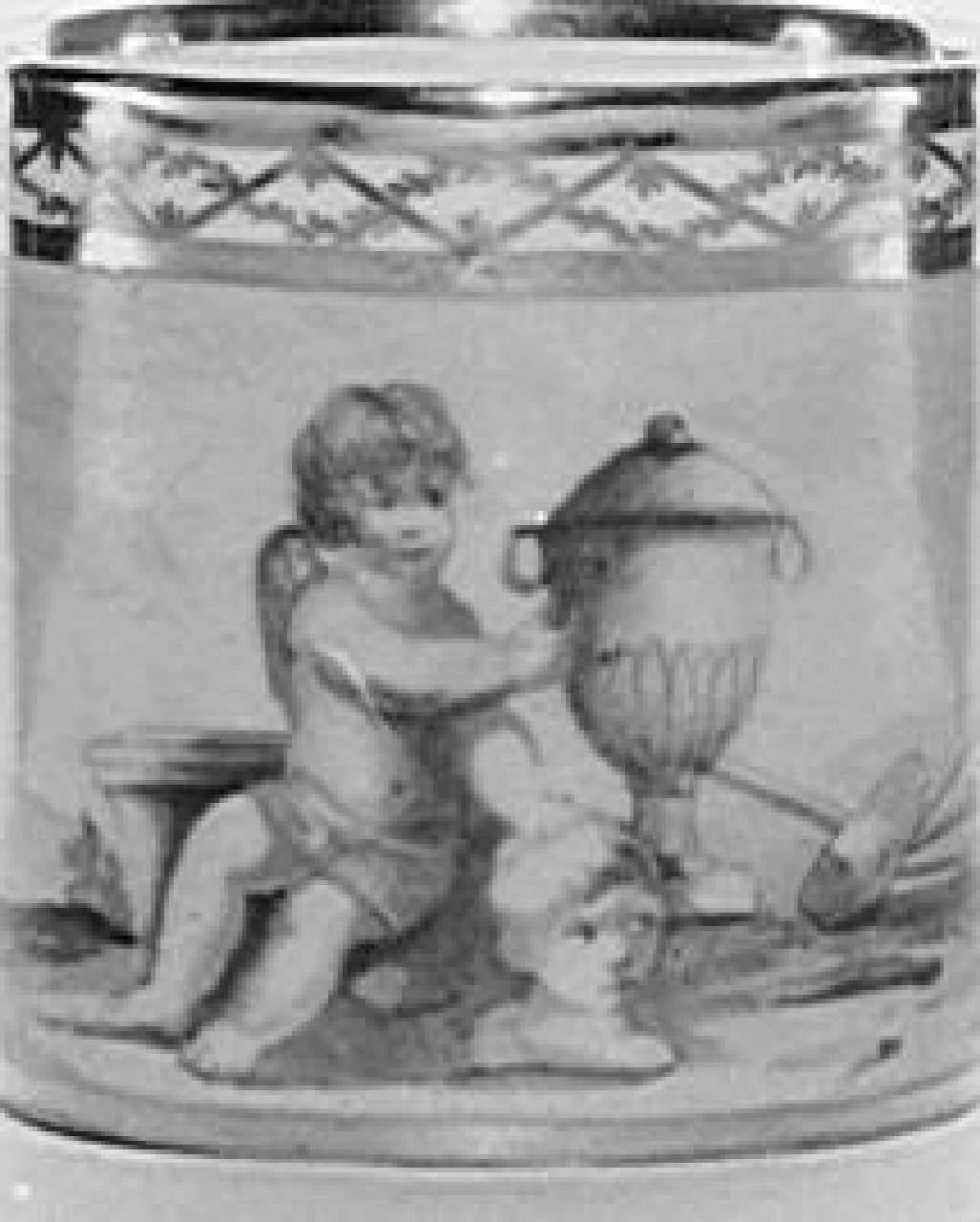 Tazzina cilindrica con ansa. Porcellana bianca, dipinta di giallo con bordi oro con motivo a graticcio. Sulla tazzina, una serie di putti a monocromo che compongono l'allegoria della scultura.