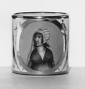 Tazzina con figura femminile in abbigliamento contemporaneo, con abito, cuffia, a mezzobusto, in seppia