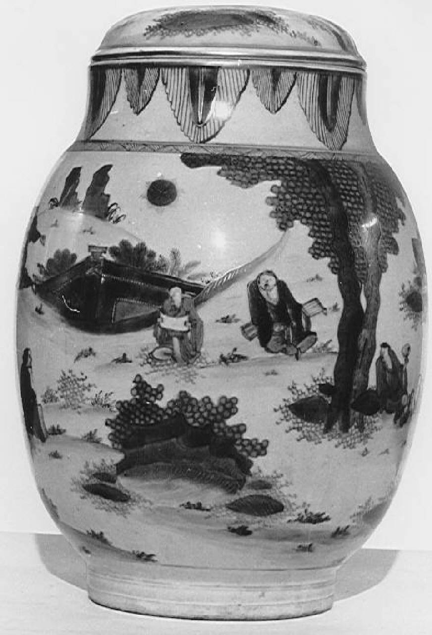 Vaso in porcellana di forma pressoché ovoidale, con basso piede circolare, pancia espansa e breve collo terminante a labbro dritto sul quale poggia un coperchio a calotta schiacciata. La decorazione, che avvolge tutto il pezzo, è realizzata nella tavolozza detta "imari", in arancione e oro sopra coperta e blu sotto coperta, con accenni di verde molto chiaro. In un giardino ideale caratterizzato da una staccionata, rocce, alberi e una pianta di banano, quattro letterati conversano e leggono. Sul retro l'immagine è chiusa idealmente da un serie di nuvole stilizzate. Un quinto è raffigurato sul coperchio sotto una pianta di salice piangente.