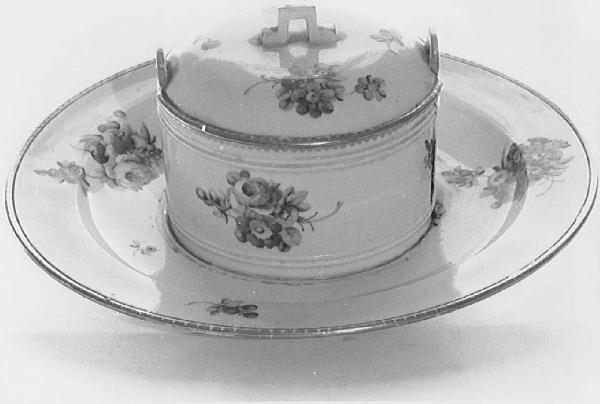 - NOTIZIE STORICO CRITICHE Le due torce stilizzate intrecciate tracciate in blu che compaiono sotto le porcellane del servizio da tavola sono state identificate da Mariolina Olivari con la marca della manifattura di Locré, detta anche "de la Courtille" dal nome del quartiere parigino dove aveva sede. La manifattura era stata fondata nel 1772 in Rue de la Fontaine-au-Roi, a Parigi, da Jean-Baptiste Locré de Roissy che nel luglio 1773 aveva depositato la sua marca, due fiaccole stilizzate incrociate in blu, che opportunamente semplificate possono essere scambiate per la marca di Meissen. Lo stesso fondatore aveva denominato la fabbrica "manifacture de porcellaine allemande" e la stretta somiglianza con Meissen era il punto di forza della sua produzione, sottolineato dall'adozione di un repertorio decorativo, quello dei fiori "au naturel", inventato presso la Manifattura di Vienna ma reso celebre proprio da Meissen. Questa caratteristica era rafforzata dal fatto che il modellatore della fabbrica - e dal 1787 nuovo proprietario della stessa - era Laurent Russinger, che proveniva dalla manifattura tedesca di Höchst (Magonza). \nIl servizio del conte Luigi Tadini, già ritenuto un prodotto di Meissen anche per l'ambigua indicazione "Servizio di Sassonia" con la quale era segnalato sulla nota d'acquisto, purtroppo non datata, rappresenta al meglio la qualità della produzione tanto nelle forme (molte delle quali mutuate da Sèvres), quanto negli ornati, con il raffinato decoro a fiori "au naturel" pure ispirato al decoro di Meissen. La plausibile datazione al 1780-1790 non esclude la possibilità che l'acquisto possa essere avvenuto a Parigi, nel corso del soggiorno del 1802 dopo i Comizi di Lione. \nMarco Albertario