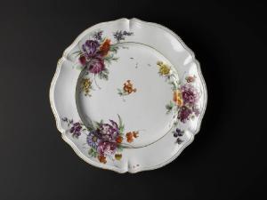 Il piatto è dipinti a mazzetti di fiori "au naturel", in gruppo di tre, distribuiti sulla tesa ed un piccolo fiore centrale. Ha bordi sagomati e orlati con contorno oro e una fitta decorazione a dente di lupo.