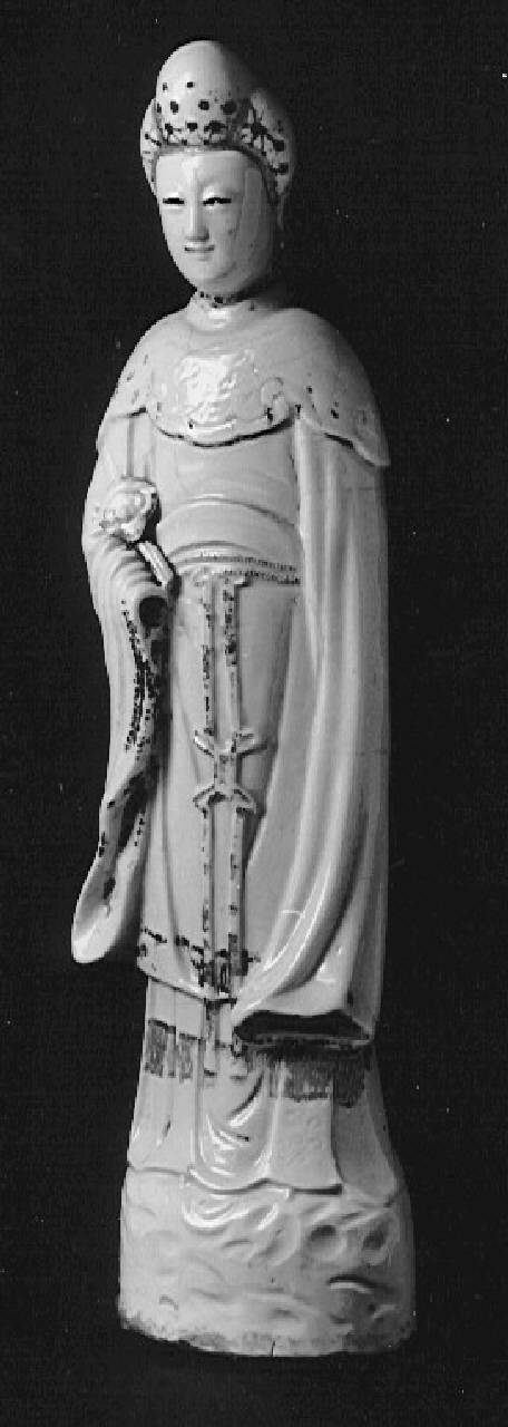 - NOTIZIE STORICO CRITICHE L'immagine di questa dama si riconosce come divinità per la base a forma di nuvole. Potrebbe trattarsi di Guanyin (Avalokitesvara), spesso rappresentata con lo scettro ruyi. Le statuette raffiguranti dame con lo scettro ruyi (traducibile in "come tu vuoi") erano in epoca Qing un comune regalo benaugurale. Statuette simili si trovano nella collezione Ala Ponzone, ma nel catalogo delle ceramiche orientali le stesse sono indicate come produzioni in porcellana di Dehua. In questo caso, la decorazione, forse ottenuta a crudo e realizzata in Europa, è la medesima, ma la tipologia ceramica è diversa, trattandosi di una ceramica o di una "porcellana tenera" molto leggera. Produzioni a pasta molle, realizzate a stampo, come in questo caso, e con vetrina tipicamente color crema, si trovano secondo He Li dal periodo Ming (1368-1644) sia nello Hebei, presso le fornaci di Pengcheng (dette tuding, ovvero ding provinciale o terroso), sia nel Fujian, presso le fornaci zhangzhou, che tipicamente riproducevano lo stile delle porcellane di Dehua. Se non si tratta di una produzione europea a imitazione cinese, proprio la somiglianza con le produzioni Dehua farebbe dunque propendere per un'attribuzione alle fornaci zhangzhou.