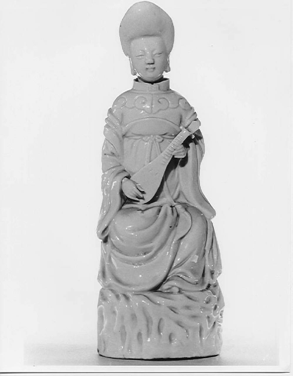 - NOTIZIE STORICO CRITICHE La porcellana di Dehua, detta anche Blanc de Chine per il fatto di non essere quasi mai colorata, si distingue per la particolare durezza e fredda lucentezza. Questa caratteristica, costante nel tempo, e la ripetizione dei soggetti, ne rende difficile una datazione precisa. Nell'iconografia asiatica, il liuto (pipa) è spesso associato alle ninfe celesti (apsara) che abitano i cieli e i paradisi. In questo caso la figura veste panni tipicamente cinesi del periodo Qing e, pur trovandosi su un piedistallo a forma di nuvola, mantiene una posizione statica. Lo strumento a corda rappresenta purezza di mente e fedeltà. Una suonatrice di liuto in una pesante veste invernale può anche rappresentare la concubina Zhaojun che visse sotto la dinastia Han e che fu inviata in dono dall'imperatore agli Xiungnu, popolazione della Cina settentrionale, come dono per concludere un trattato di pace.