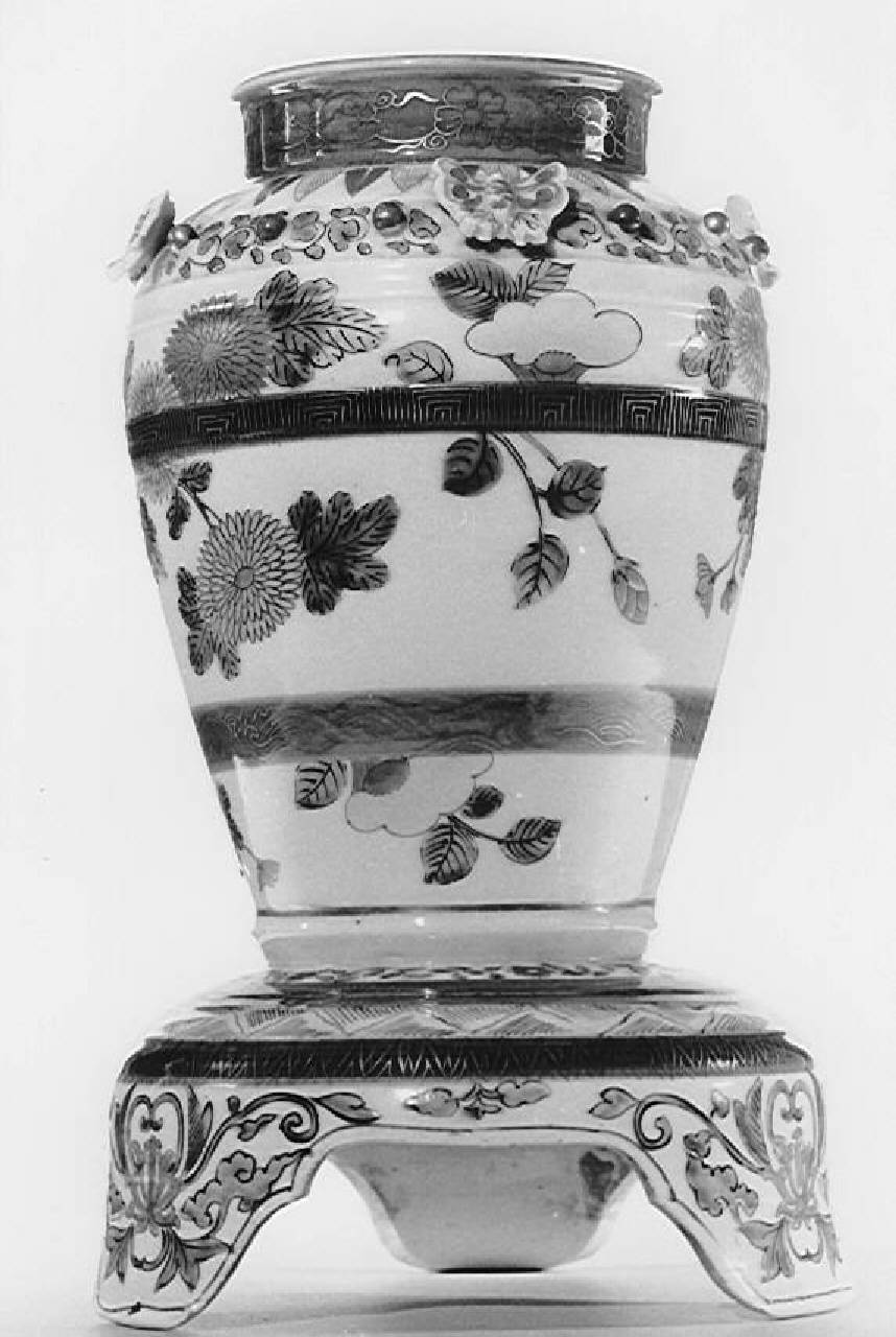 Vaso di forma espansa, poggiante su una base ampia, a calotta che poggia modanata a tripode, pancia che si espande dal fondo terminando a spalla alta che si chiude su un breve collo con labbro leggermente everso. Sulla spalla sporge una teoria di bullette interrotte da quattro farfalle applicate e uniformemente distanziate. L'ornato nei colori della paletta imari, con blu cobalto sotto coperta e rosso e oro sopra coperta, con aggiunta di smalto palpabile verde, si compone di fasce blu circolari distanziate orizzontalmente e decorate con girali in oro, racemi fioriti di crisantemi e magnolie attorno al corpo centrale. Sulla base si trovano fiori stilizzati di magnolia o loto.