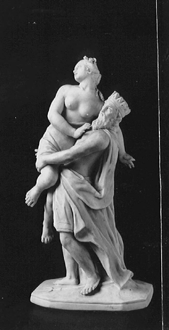 Gruppo scultoreo posto su piccola base rettangolare con angoli smussati. Raffigura Poseidone incoronato mentre solleva fra le braccia Teti.