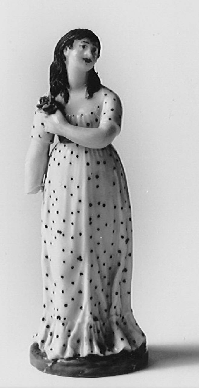 Giovane donna con lunga veste bianca a pois neri, scendente a pieghe; nella mano sinistra tiene una rosa blu.