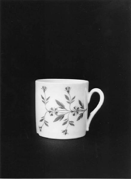 Tazzina di forma cilindrica con ansa, ornata con sottili rametti di fiori azzurri con foglie verdi su fondo bianco.