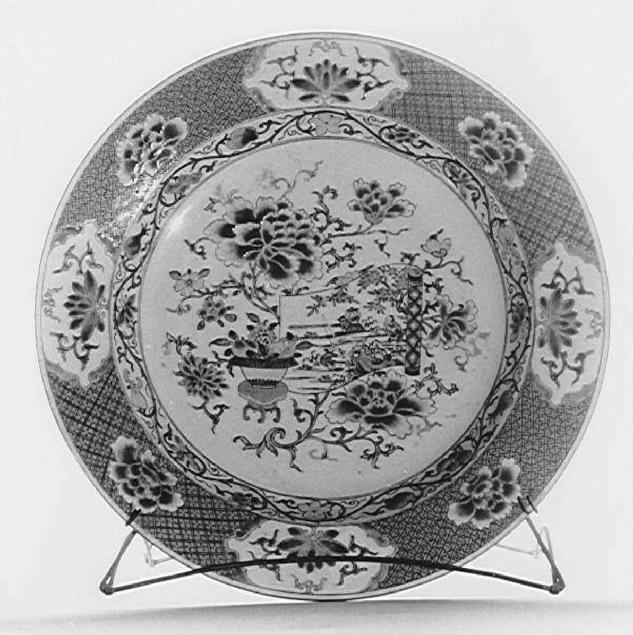 Grande piatto in porcellana decorato a smalti sopra coperta e a leggero rilievo, nei colori della famiglia rosa (yangcai). L'ornato è costituito al centro da un motivo benaugurale composto da racemi di peonia e crisantemo, un rotolo dipinto raffigurante un paesaggio lacustre abitato da un bambino e una barca con un pescatore, probabilmente con riferimento a una scena letteraria, e un tavolino sul quale è appoggiata un'alzata con frutta. Sulla breve parete curva si distinguono campanule, pesche e frutti detti "mano di buddha", mentre la tesa è caratterizzata da un fondo rosa con graticcio nero e riserve campite da peonie e loti. Prevale il rosa, in due gradazioni. Gli altri colori utilizzati sono il blu, il giallo e il verde.