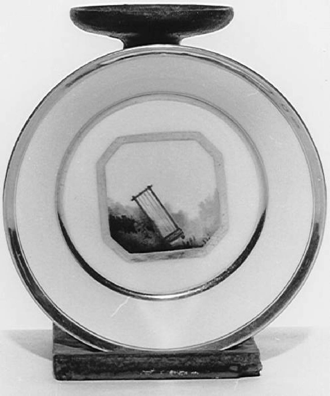 Piattino da caffé di porcellana bianca con bordi oro. Al centro, una lira e un cenno di paesaggio
