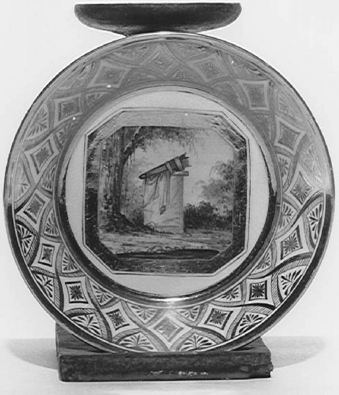 Piattino con decorazione dorata sulla tesa; al centro, faretra deposta su un'ara.