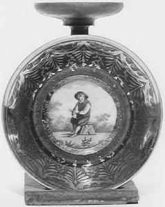 Piattino troncoconico ornato oro su fondo blu. Sul fondo contadino seduto. Figura in monocromo.