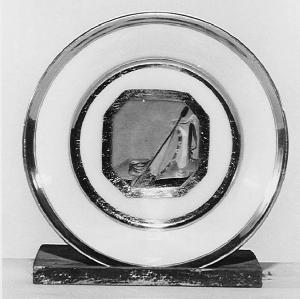 Piattino in porcellana con bordi dorati; al centro tamburo a cornice, anfora e lancia.