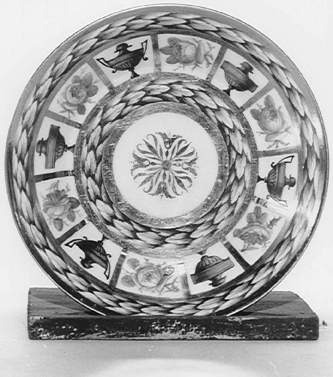 piattino decorato a fasce di alloro a monocromo alternate a fasce divise in riquadri contenenti urne e rose