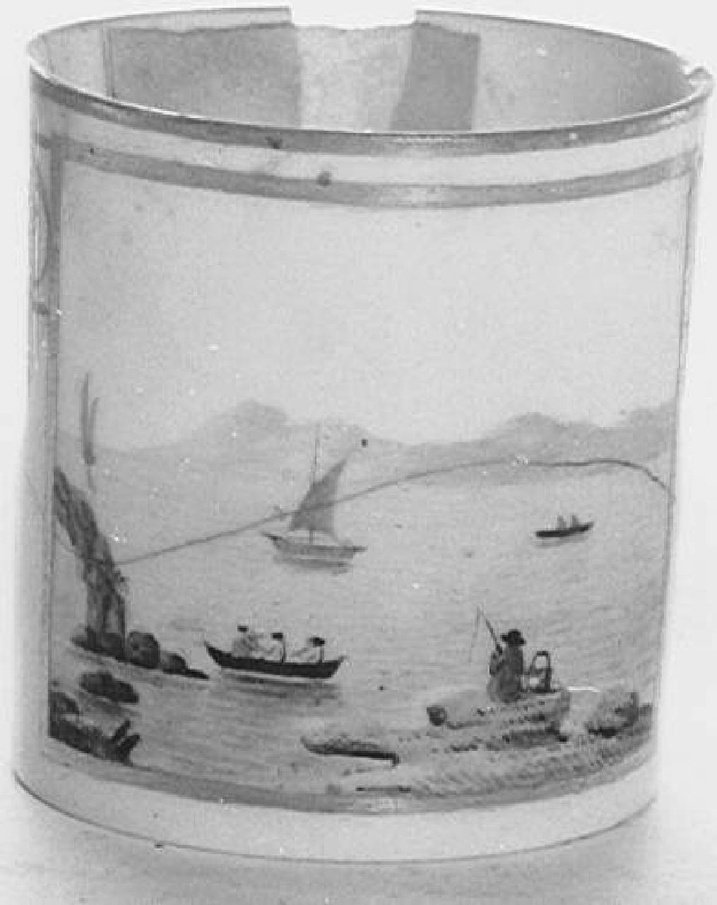 Tazzina di forma cilindrica con ansa. Bordo a semplice linea. Sulla tazzina, paesaggio a colori con barche sul mare, pescatore