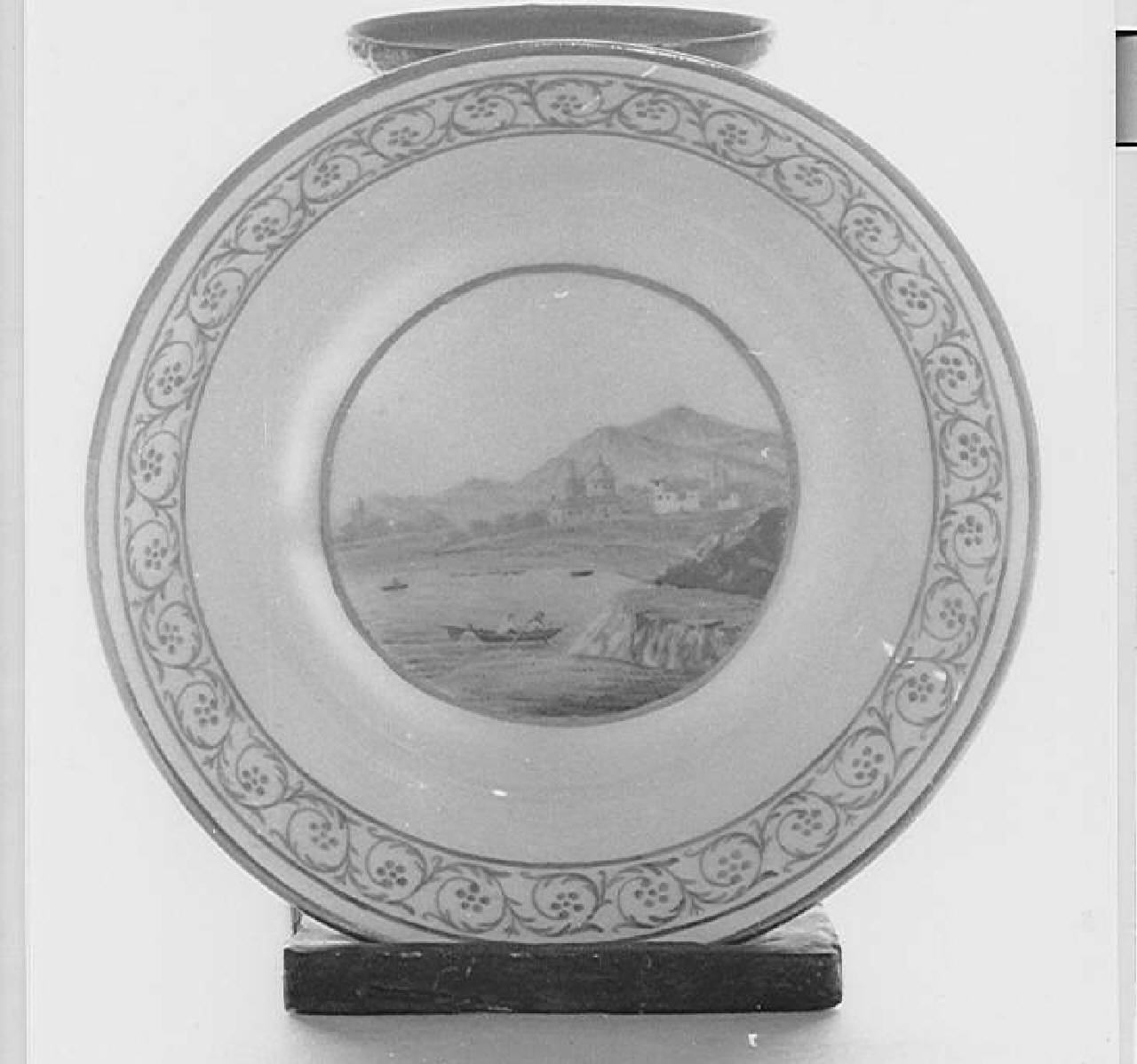 - NOTIZIE STORICO CRITICHE La marca "N" consente di riferire la tazza alla Reale Fabbrica di Porcellana di Napoli. La tazza presenta bordi a fili dorati e con un sottile fregio vegetale color rosso seppia. Tanto le dodici tazze cilindriche, quanto la zuccheriera presentano vedute del regno di Napoli, secondo un gusto ben noto all'interno della Manifattura, incorniciate da un sottile fregio vegetale color rosso seppia e da un bordino dorato. \nL'esecuzione delle vedute, basate su di una stesura a macchia che contrasta con la pennellata puntiforme di Giacomo Milani, celebre decoratore attivo in quell'arco di tempo, ha portato A. Pacia (2011), cui si deve la valorizzazione del servizio, a posticipare la datazione, fissata da A. Mottola Molfino (1977) intorno al 1780, al decennio successivo.\nMarco Albertario