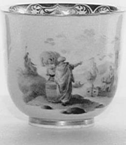 Le tazzine sono caratterizzate dalla forma piuttosto ampia e dal manico a spigoli vivi, ispirato - come ha notato Pacia 2011, ai primi manici barocchi di Meissen. I soggetti si distaccano dal consueto repertorio del decoratore Giovanni Caselli e comprendono scene dei porti, marine con vivaci figurine di soldati, di facchini, e personaggi in vesti orientali; la veduta è animata da fari, colonne e piramidi che richiamano la moda dell'esotico della piena stagione rococò francese.