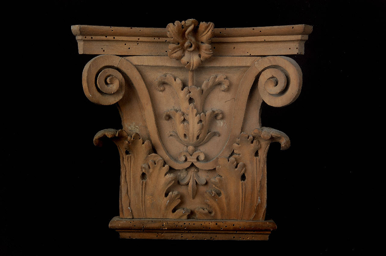 Capitello fasciato di foglie di acanto con volute e inflorescenza centrale, abaco ricurvo