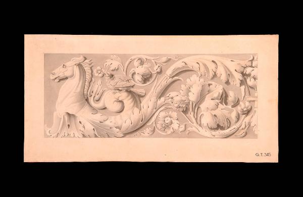 Motivi decorativi a girali d'acanto con uccellino e testa di cavallo