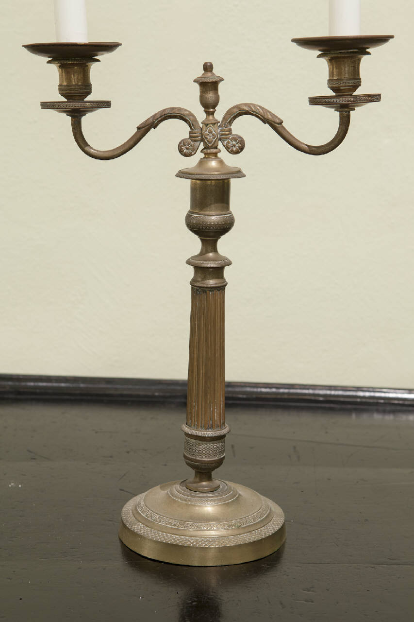 - NOTIZIE STORICO CRITICHE Il candelabro a due bracci o doppiere è una tipologia frequente già nel XV secolo ma si diffuse soprattutto a partire dal Settecento. Nella coppia in esame, i due bracci risultano divaricati simmetricamente rispetto ad un fusto scanalato. La ripresa di elementi decorativi dal repertorio antico esprime quel rinnovamento linguistico in senso classicista a cavallo tra Settecento e Ottocento che andava sfoltendo i decori barocchetti, razionalizzandoli in una impaginazione più rigorosa. La disposizione assolutamente simmetrica e l'uso di tecniche industriali come lo stampaggio e la godronatura inducono a datare i manufatti al primo quarto dell'Ottocento.\nI candelabri, che fanno parte del legato del conte Tadini del 1828, risultano schedati dalla Soprintendenza per ben due volte: la prima nel 1976 (num. NCTN 03/00020672), quando si trovavano nella sacrestia della cappella gentilizia; la seconda nel 1980 (num. NCTN 03/000207822), quando erano collocati nella Sala IX della Galleria dell'Accademia. Attualmente sono esposti nella Sala XX.