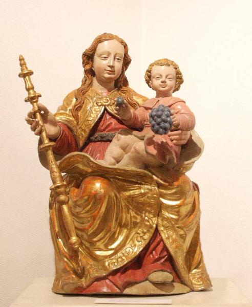 Statua scolpita a tutto tondo, in legno di tiglio dipinto e dorato. Parte della figura è svuotata sul retro. Raffigura una Madonna seduta , con il Bambino in braccio e uno scettro nella mano destra. Il Bambino tiene un grappolo d'uva nella sinistra e mostra un acino con la mano destra. La Madonna è avvolta in un ampio manto dorato, il Bambino veste una corta veste rosa.