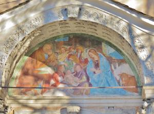 L'affresco occupa l'ampia lunetta del protiro della chiesa domenicana di S. Antonio a Morbegno, al di sopra del portale con un alto rilievo. Sono rappresentati la Madonna a destra in adorazione del Bambino, tenuto nelle braccia da due angeli, mentre altre due creature angeliche suonano strumenti musicali; alla sinistra lo spazio arcuato è riempito dalla figura di Giuseppe, in piedi, che si protende verso il centro. Dietro la Vergine si vedono l'asino e il bue e uno sfondo naturalistico. Spicca il bel manto blu di lapislazzulo della Madonna inginocchiata.