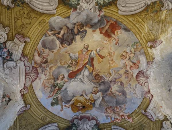 Al centro della volta del presbiterio della chiesa di Sant'Ignazio trova posto, inserito tra massicce quadrature, uno sfondato circolare con la rappresentazione ad affresco della Gloria di Sant'Ignazio. Il santo in abito sacerdotale, con le braccia aperte e lo sguardo rivolto verso l'alto, il capo circonfuso di luce, è trasportato verso il cielo da numerosi angeli in vesti colorate che sostengono le nuvole sulle quali Ignazio è inginocchiato. Altri angioletti, ridotti talvolta alle sole teste alate, assistono alla scena disponendosi a spirale attorno alla figura principale; tra questi, due a piena figura sono illusionisticamente seduti sul bordo della medaglia.