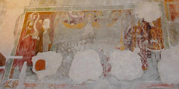 Affresco rettangolare al centro della parete orientale della navata di S. Spirito, in alto, bordato da una cornice verde e da una marrone. La raffigurazione è dominata dall'immagine della Madonna che con l'aiuto di quattro angeli svolazzanti allarga il proprio manto, sotto il quale si dispongono, più piccoli, tanti devoti inginocchiati; quelli alla destra della Vergine indossano l'abito bianco con cappuccio distintivo della confraternita dei Battuti o Disciplini. Assistono alla scena quattro figure stanti, sulla sinistra San Giovanni Battista e Santa Marta, sul lato opposto due personaggi in ricchi abiti damascati, sicuramente Sant'Orsola accompagnata da un santo non ancora identificato.