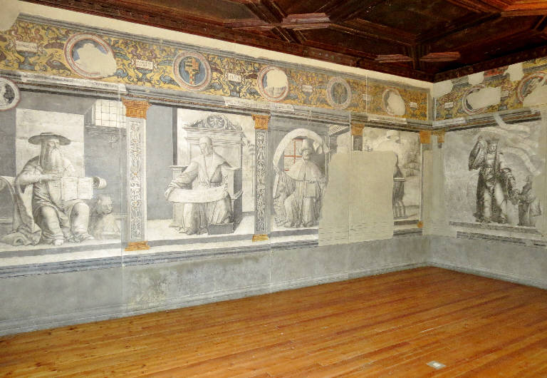 - NOTIZIE STORICO CRITICHE La "camera picta di Traona", riferita al 1534 dagli studiosi, proviene da una stanza di una casa signorile di Traona appartenuta alla famiglia Dell'Oro e forse in precedenza ai Vertemate. Lo strappo è avvenuto nel 1958 ad opera del restauratore Giuseppe Arrigoni di Bergamo e l'anno successivo i dipinti murali, impoveriti dall'operazione, sono stati trasferiti su pannelli di tela e portati a palazzo Besta di Teglio. Il ciclo sembra figlio di una mano unitaria e il pittore, al quale per ora non sono stati ricondotti altri episodi, è stato convenzionalmente battezzato "Maestro di Traona".\nNe tratta per primo Roberto Togni che, nel rilevare il contenuto fortemente allegorico di pitture così ricche di scritte, suppone contengano riferimenti al dibattito religioso tra Cattolici e Riformati. Sempre secondo il Togni, le scene mostrano derivazioni dai repertori a stampa di ambito ferrarese e centro-italico, ma non mancano rimandi alla cultura nordica, penetrata nelle valli alpine soprattutto con il diffondersi delle incisioni del Dürer. Il ciclo è denso di stemmi, cartigli, iscrizioni varie, distribuite dentro e fuori le scene figurate; Roberto Togni ne trascrive alcune, chi dopo di lui si è occupato della "camera picta" riporta solo pochissime scritte, a motivo probabilmente delle difficoltà di lettura e di interpretazione. Di recente Marco Foppoli ha però riconosciuto alcuni degli stemmi familiari rappresentati nel "fregio araldico" e precisato come gli stessi intervengano a corredo di un tema figurativo più ampio, come spesso avveniva nel Cinquecento (Foppoli 2008).\nIl ciclo è espressione del favore accordato dal Rinascimento maturo ad una cultura di stampo umanistico-cristiano, imbevuta di richiami alla classicità e connotata in senso allegorico e moraleggiante. In ambito locale l'episodio si apparenta ad altri (affreschi di palazzo Vertemate, gli stessi affreschi di palazzo Besta, solo per citare i più studiati) che ugualmente si richiamano ad una cultura figurativa colta ed elaborata fuori dai confini della Valtellina.