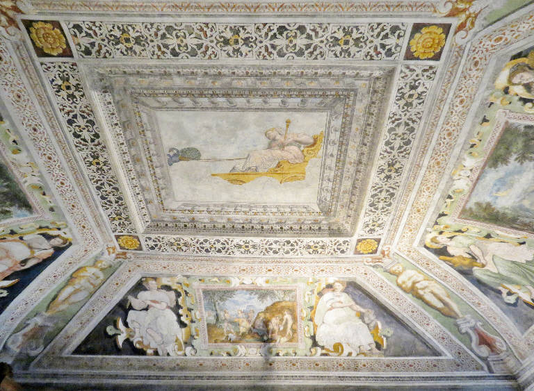 - NOTIZIE STORICO CRITICHE Le sale affrescate di palazzo Vertemate di Piuro rientrano in un programma decorativo unitario, eseguito da un ignoto pittore lombardo, senz'altro affiancato da aiuti, durante l'ottavo decennio del XVI secolo su incarico dei fratelli Luigi e Guglielmo Vertemate, facoltosi commercianti che possedevano nella vicina Piuro palazzi altrettanto sontuosi, stando almeno alle fonti antiche: le residenze stabili dei Vertemate non ci sono più, in quanto il ricco borgo di Piuro andò distrutto sotto la rovinosa frana del 1618; palazzo Vertemate si salvò perché giaceva fuori dal paese, essendo stato concepito come una villa di delizia, perfetta per lo svago della famiglia e degli illustri ospiti.\nLa Sala di Giunone o Sala delle adunanze si trova a piano terra, a destra dell'atrio, e la sua boiserie datata 1577 offre un appiglio cronologico considerato attendibile da tutti gli studiosi, che tendono a datare gli affreschi del palazzo in un momento immediatamente precedente e prossimo al termien dei lavori di costruzione della villa. Come in altre stanze, anche qui lo spunto viene dalle Metamorfosi di Ovidio, ma accanto alle Storie di Callisto e di Danae, rivali in amore di Giunone, rappresentata al centro della volta, troviamo ornati classicheggianti e figure allegoriche che, secondo Luca Marazzi, rimandano alle attività da cui la famiglia traeva la sua ricchezza, e in particolare il commercio e l'agricoltura. Secondo Francesco Frangi l'ottocentesco riferimento ai fratelli Campi non è del tutto fuorviante, se proposto come riferimento culturale in senso lato e se si tiene conto della gran diffusione di studi prospettico-illusionistici a partire dalle realizzazioni di Giulio Romano a palazzo Te. Frangi nelle sale del palazzo riscontra significative tangenze anche con l'opera del bresciano Lattanzio Gambara, già collaboratore di Giulio e Antonio Campi, e riferimenti ai milanesi Aurelio Luini e Giuseppe Meda. Simonetta Coppa mette in evidenza il tono stilistico sostenuto delle decorazioni e, nell'accogliere le analisi di F. Frangi, conclude che la bottega operante a Piuro possedeva una cultura eclettica ed era fortemente aggiornata sulla pittura lombarda contemporanea.