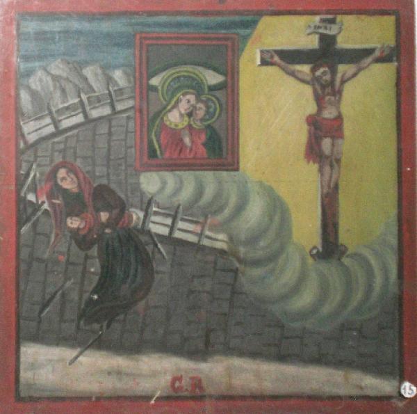 Tavoletta rettangolare di legno dipinta; finta cornice rossa dipinta.\nEx voto raffigurante sulla sinistra una donna con bambino stretto al seno mentre sta precipitando dal ciglio di una strada. Al centro, in alto, un quadretto con cornice raffigurante la Vergine col Bambino; a destra, tra nuvole biancastre e luce gialla, il Crocefisso. In basso, ai piedi del muro della strada, scorre un fiume. In rosso le due lettere: G.R.