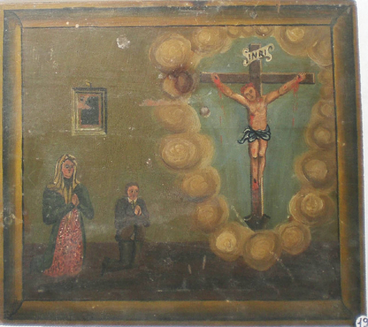Tavoletta rettangolare di legno dipinta.\nEx voto che raffigura a destra il Crocefisso circondato da nuvole giallastre; a sinistra, inginocchiati in preghiera, un uomo, vestito di nero con il collo della camicia bianco, ed una donna vestita di azzurrino, con grembiule arancione a puntini neri, velo bianco in testa. Sullo sfondo, una parete su cui è appeso un piccolo quadro con cornice.