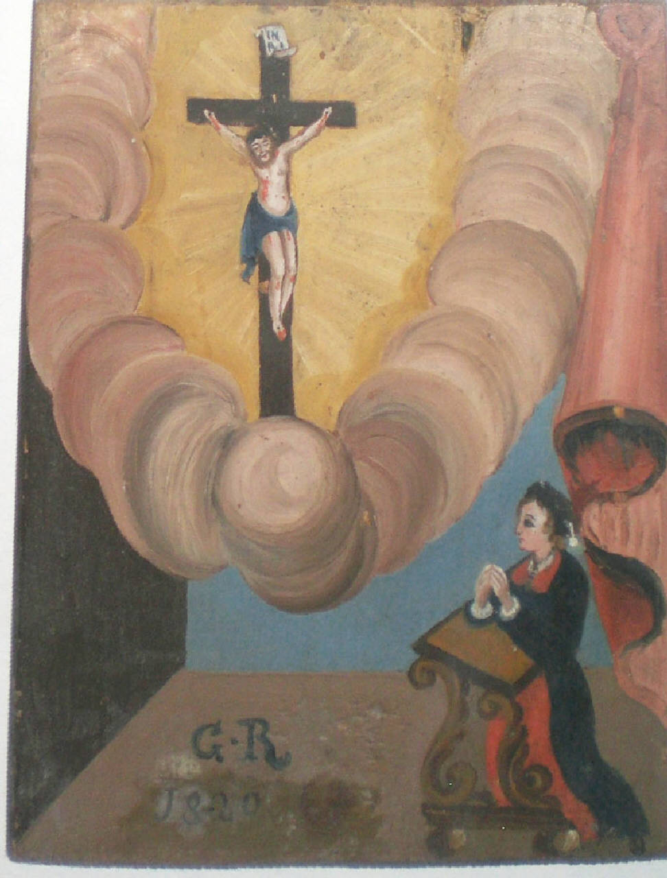 Tavoletta rettangolare di legno dipinta.\nEx voto che raffigura una donna inginocchiata, vestita di nero con grembiale rosso e cappello nero, riconoscibile come un abito di Grosio. In alto, quasi al centro, il Crocefisso tra nuvole bianche e raggi di luce; a destra un tendaggio rosso a frange nere; in basso a sinsitra, le lettere in nero: G.R. e la data 1820.