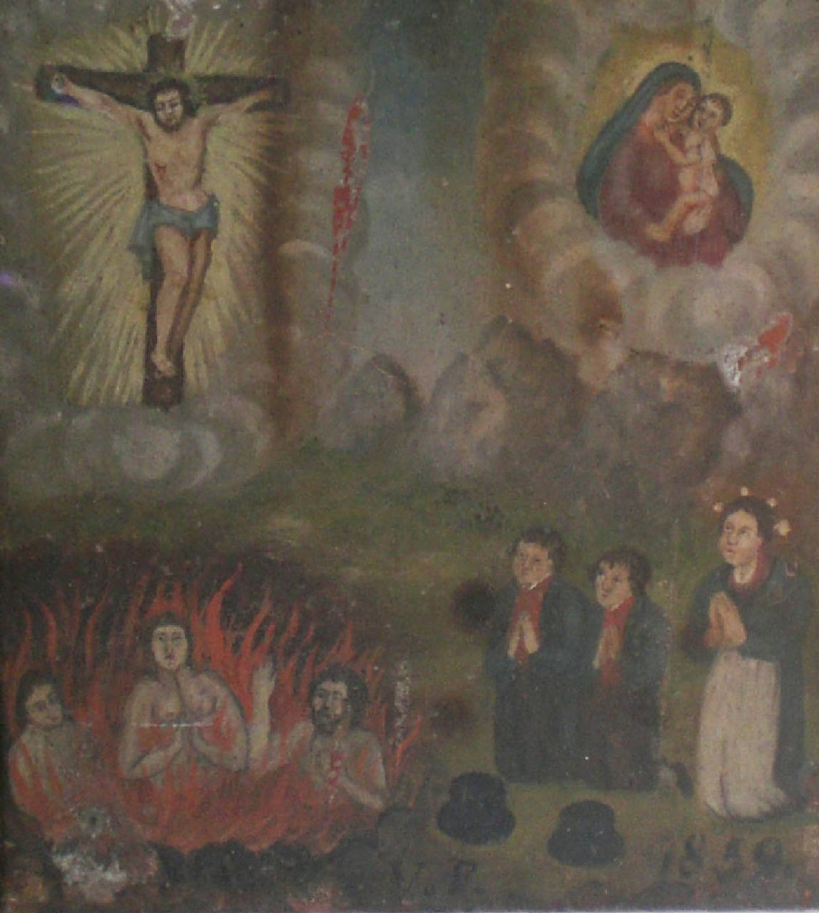 Tavoletta rettangolare di legno dipinta.\nEx voto che raffigura a sinistra, entro nubi, il Crocefisso. A destra vi sono la Madonna del Buon Consiglio col Bambino. Sotto il Crocefisso vi sono le anime purganti (una ha mani giunte ed una indica il Crocefisso con un braccio). In basso, sulla destra, vi sono due bambini ed una donna inginocchiati, hanno le mani giunte. Davanti ai due bimbi vi sono due cappelli. Queste persone hanno lo sguardo rivolto verso il Crocefisso. Compare la scritta: VF 1859